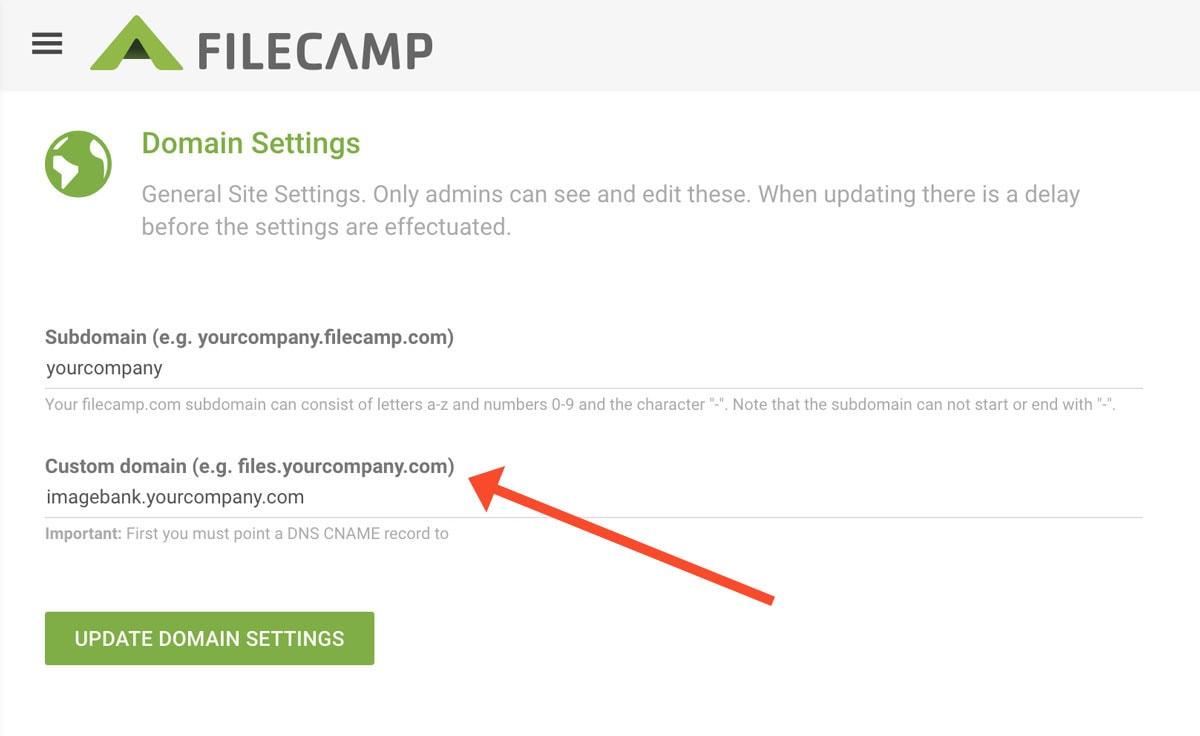 With Filecamp, using your own domain name (ex., https://imagebank.yourcompany.com) is easy and can be configured in a few minutes. Doing so involves something called a CNAME record. But don't worry it's really quite simple.