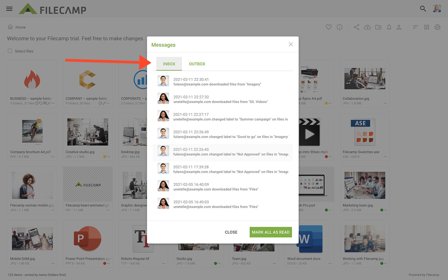 Upon navigating to the Inbox tab, you will see a list of all your messages sorted by date. The following notifications are displayed in your Inbox: