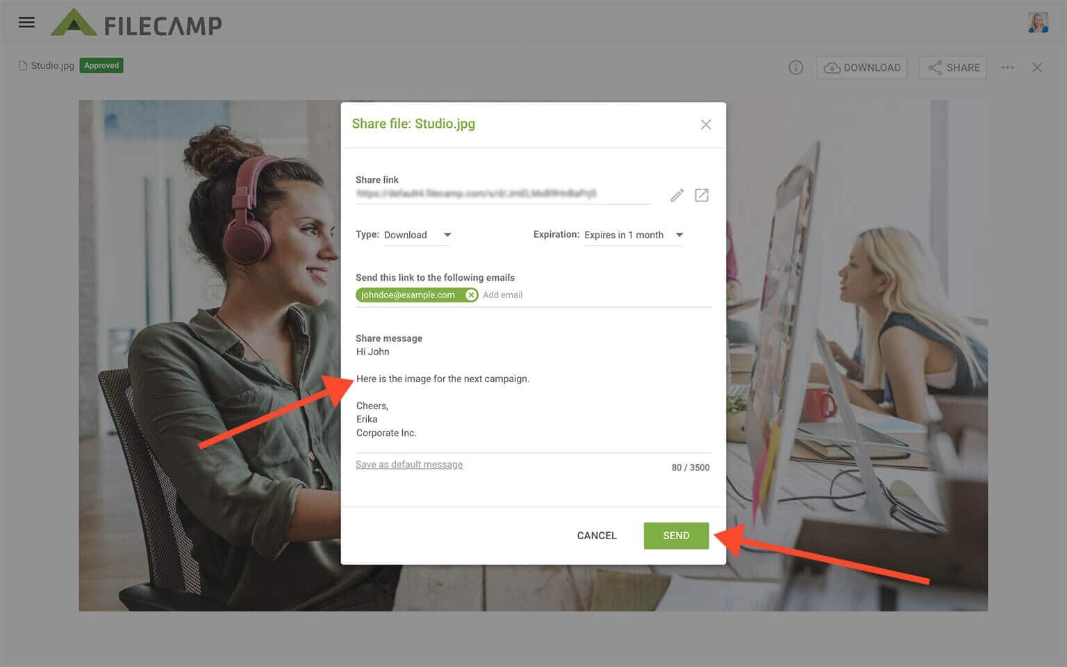 A pop-up window will appear, allowing you to customize the link’s options. You can choose whether it should be View only, Download, or View & Download, set an expiration date, specify a vanity URL, and write a message to your recipients.