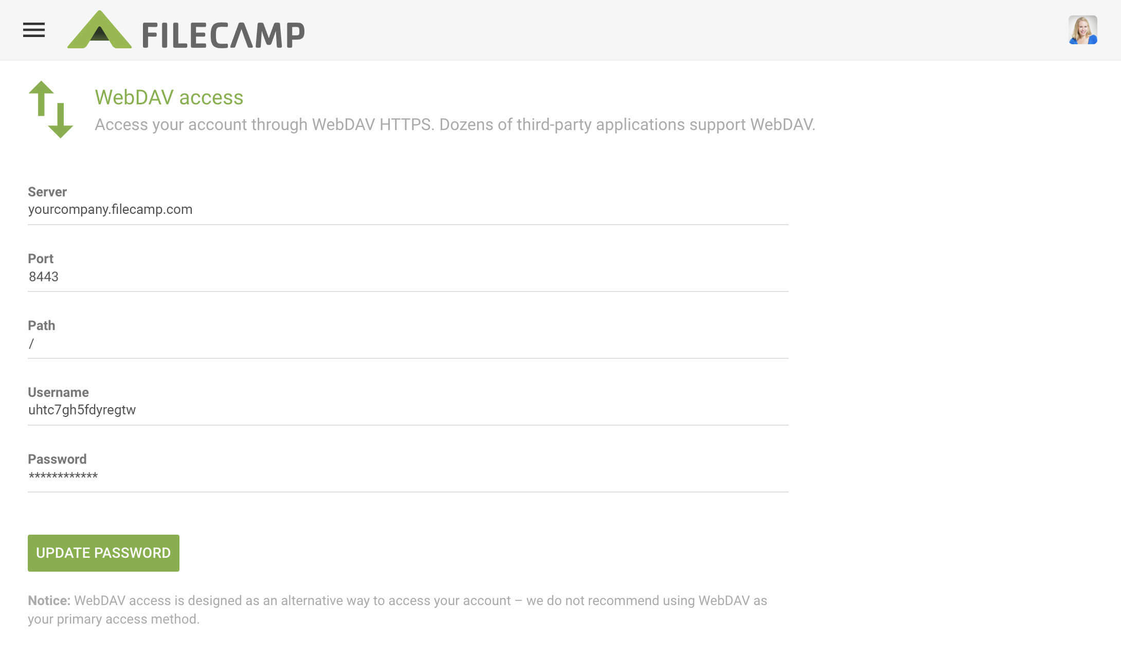 With WebDAV HTTPS you can easily and securely access your Filecamp instance.